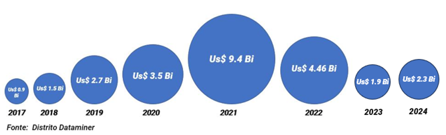 De acordo com dados do estudo Inside Venture Capital, da Distrito Dataminer, de 2017 até 2021 os investimentos em startups no Brasil multiplicaram por 10 (em dólar).